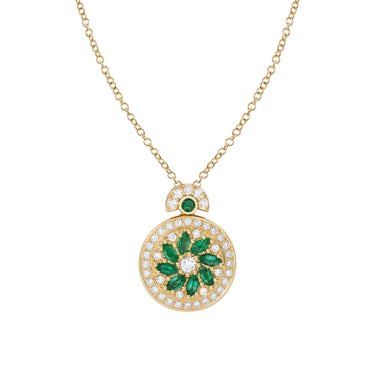 Pendant in 18K yellow gold set with white diamonds and emeralds
